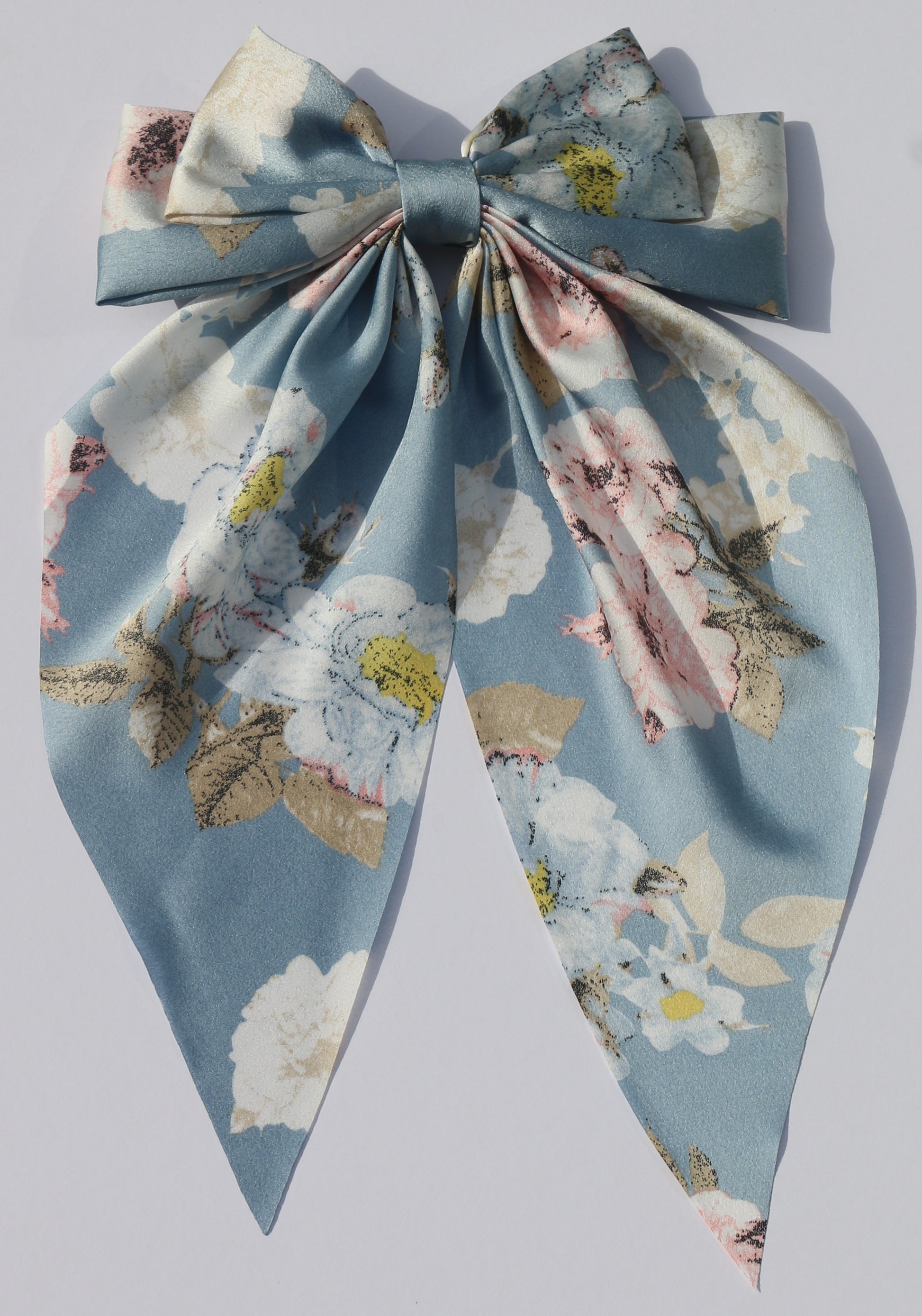 Beautiful large baby blue bow with pink and white flower pattern. Our bows have a French barrette clip that is comfortable and effortless to wear and remove.