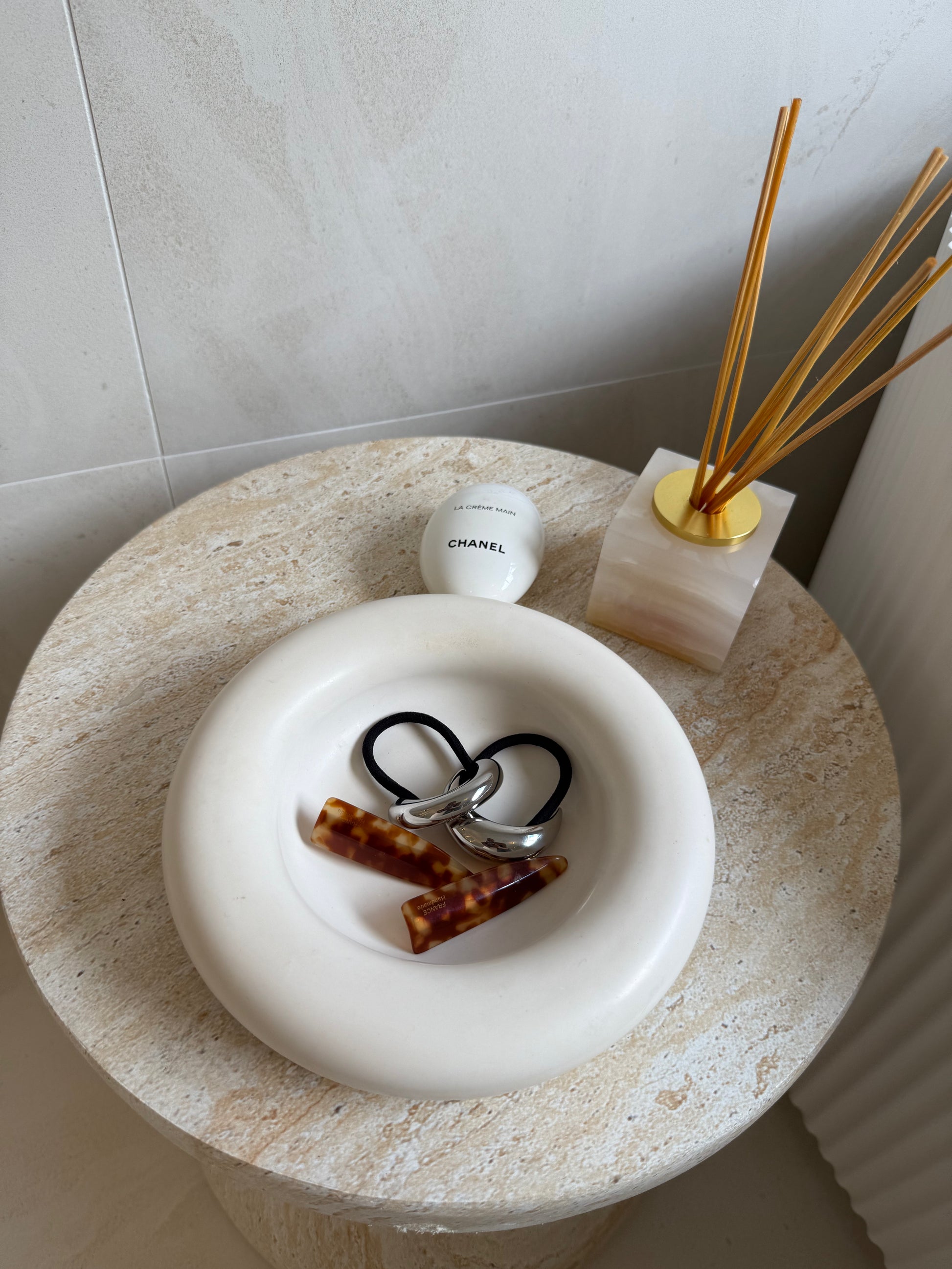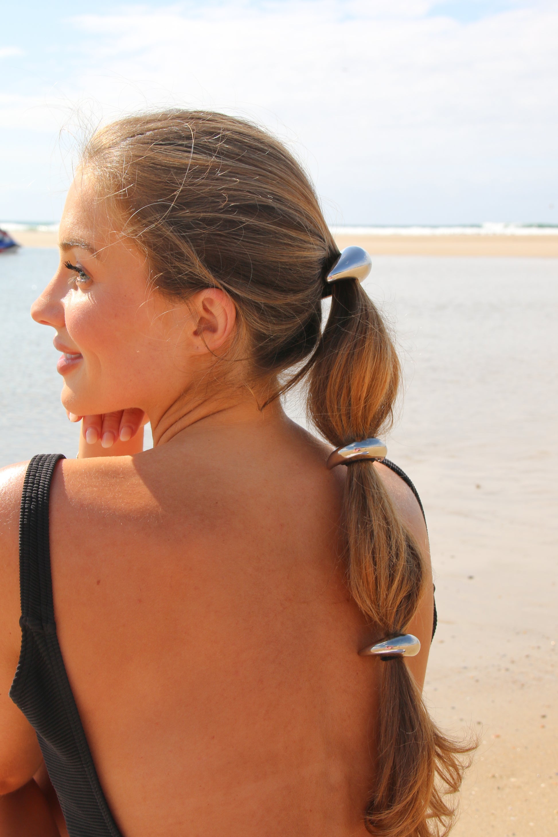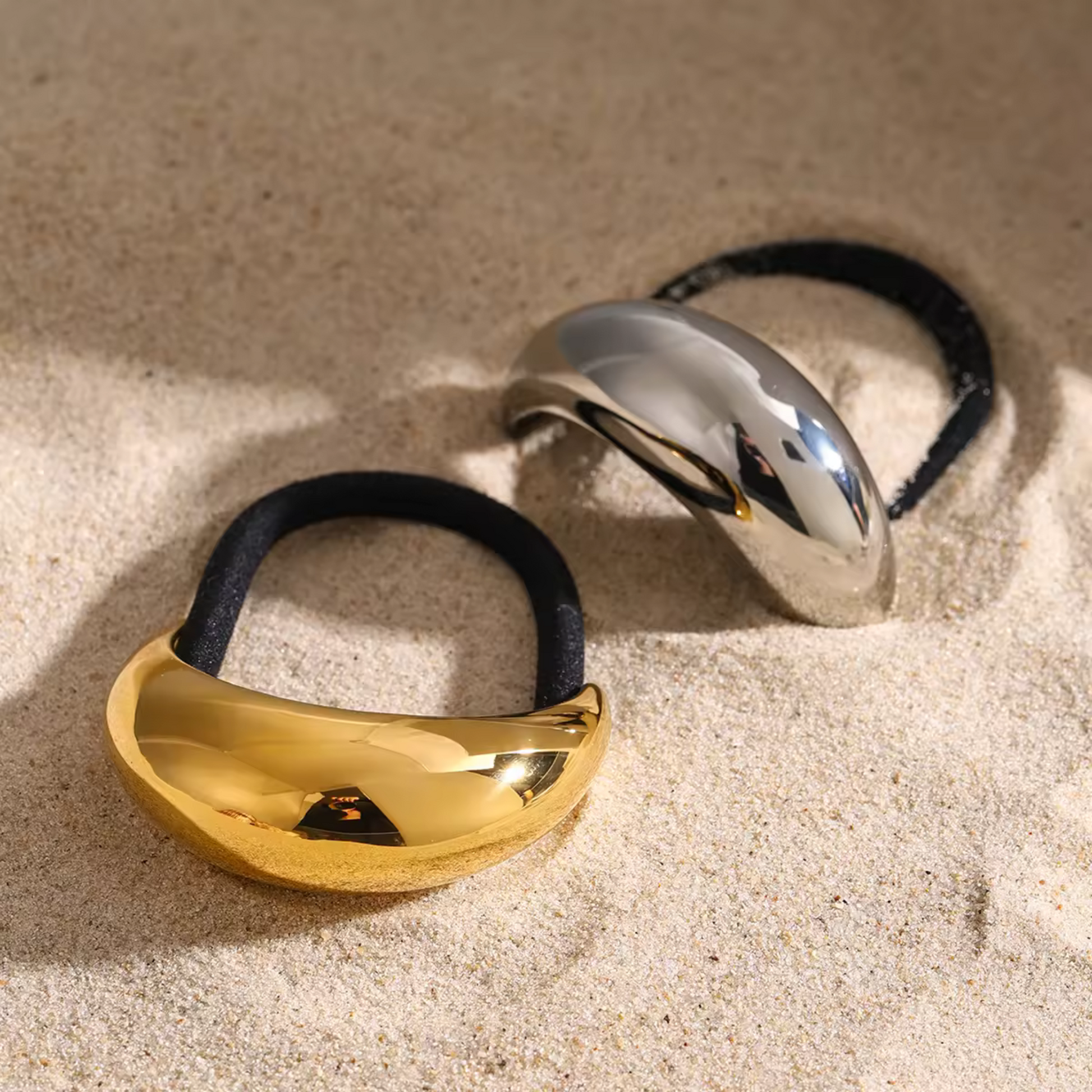 Introducing our Petite Rounded Pony Cuff Hair Ties, available in 18k gold-plated and sleek silver finishes. Crafted from high-quality stainless steel, these hypoallergenic and waterproof cuffs are perfect for all-day wear. Each cuff is paired with a durable black hair tie, adding a touch of luxury and elegance to your ponytail, whether you're at the beach, at the gym, or having a fancy dinner or fashion show our pony cuffs are all class.